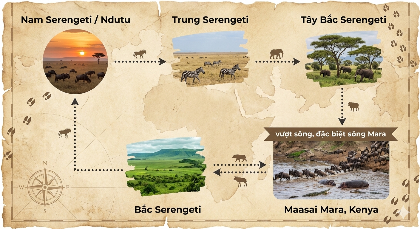 Nếu có một “đường cao tốc” của tự nhiên, thì đó chính là The Great Migration – cuộc di cư theo mùa lớn nhất hành tinh. Mỗi năm, hàng triệu động vật ăn cỏ ở Đông Phi rời nơi này sang nơi khác để tìm cỏ non và nguồn nước, tạo nên một vòng tuần hoàn sống động giữa Serengeti (Tanzania)Maasai Mara (Kenya).